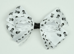 Skull white big hair clips piece, pure soft white double ribbons with rockabilly twist.