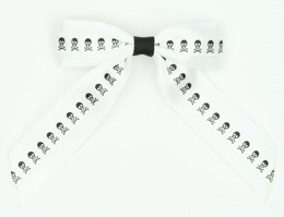 White doesn't have to be boring. Switch your ordinary white hair clip pieces with this quirky style skull black pattern prints over a pure white base knot ribbon. Made from quality satin silk fabric.