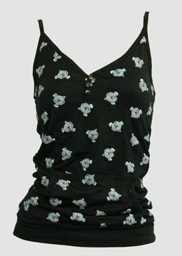Loading... Please wait...Cat grey top pocket, adorable cat print design in this black spaghetti strap ladies top with 2 side pockets.