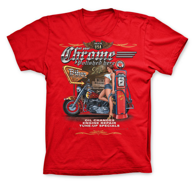 All you Biker Hotrod fans, this one of a kind t-shirt is perfect for you. Get your chrome polished here now!